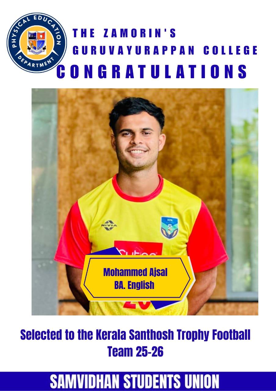 Congartulations to Muhammed Ajsal, a talented student from the BA English program at The Zamorin’s Guruvayurappan College, has achieved a remarkable milestone by being selected to represent Kerala in the prestigious Santosh Trophy Football Team 25-26