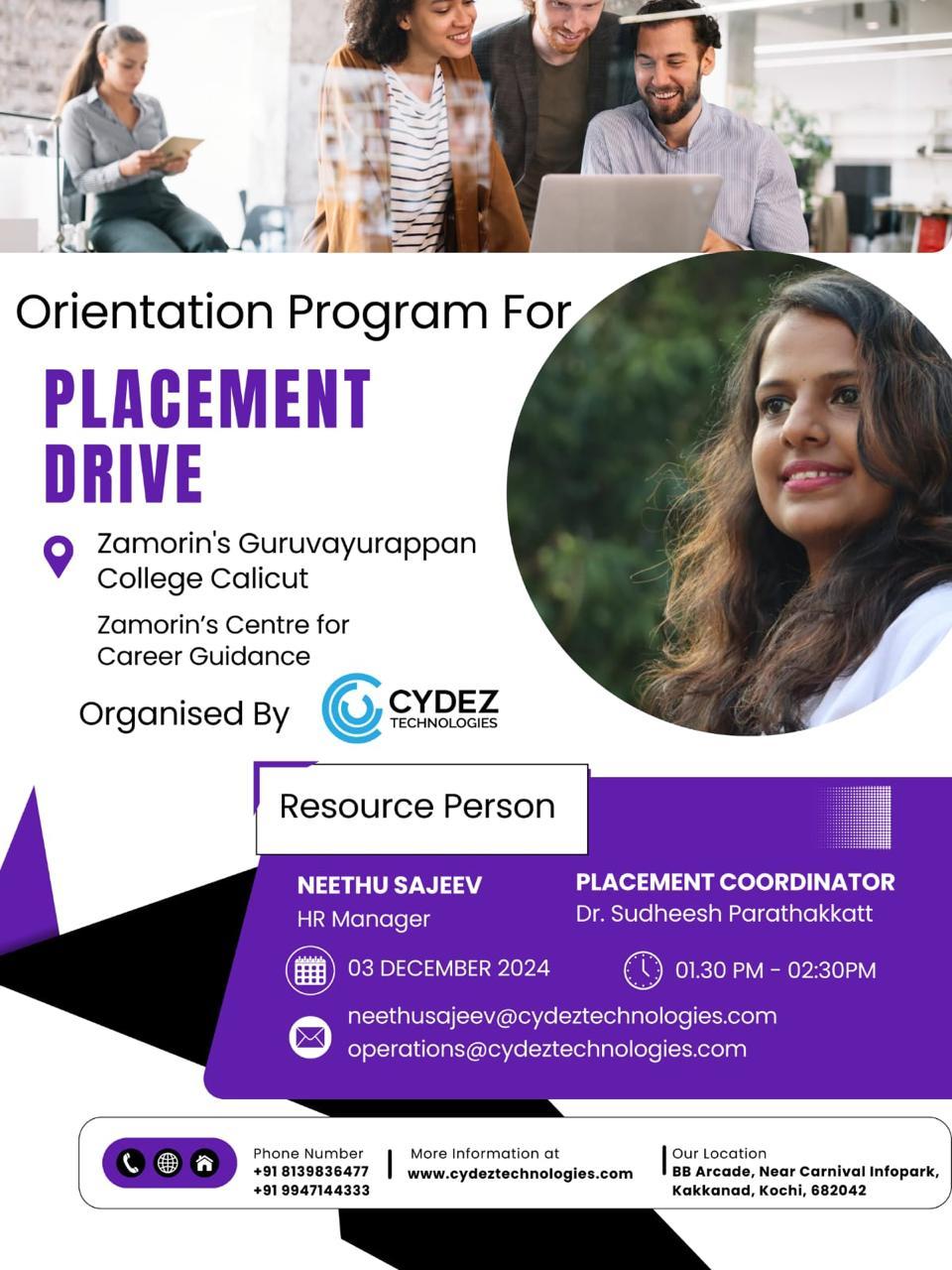 Kozhikode, December 3, 2024: The Zamorin's Centre for Career Guidance, in association with CYDEZ Technologies, successfully conducted an orientation program for the upcoming placement drive at The Zamorin's ...
