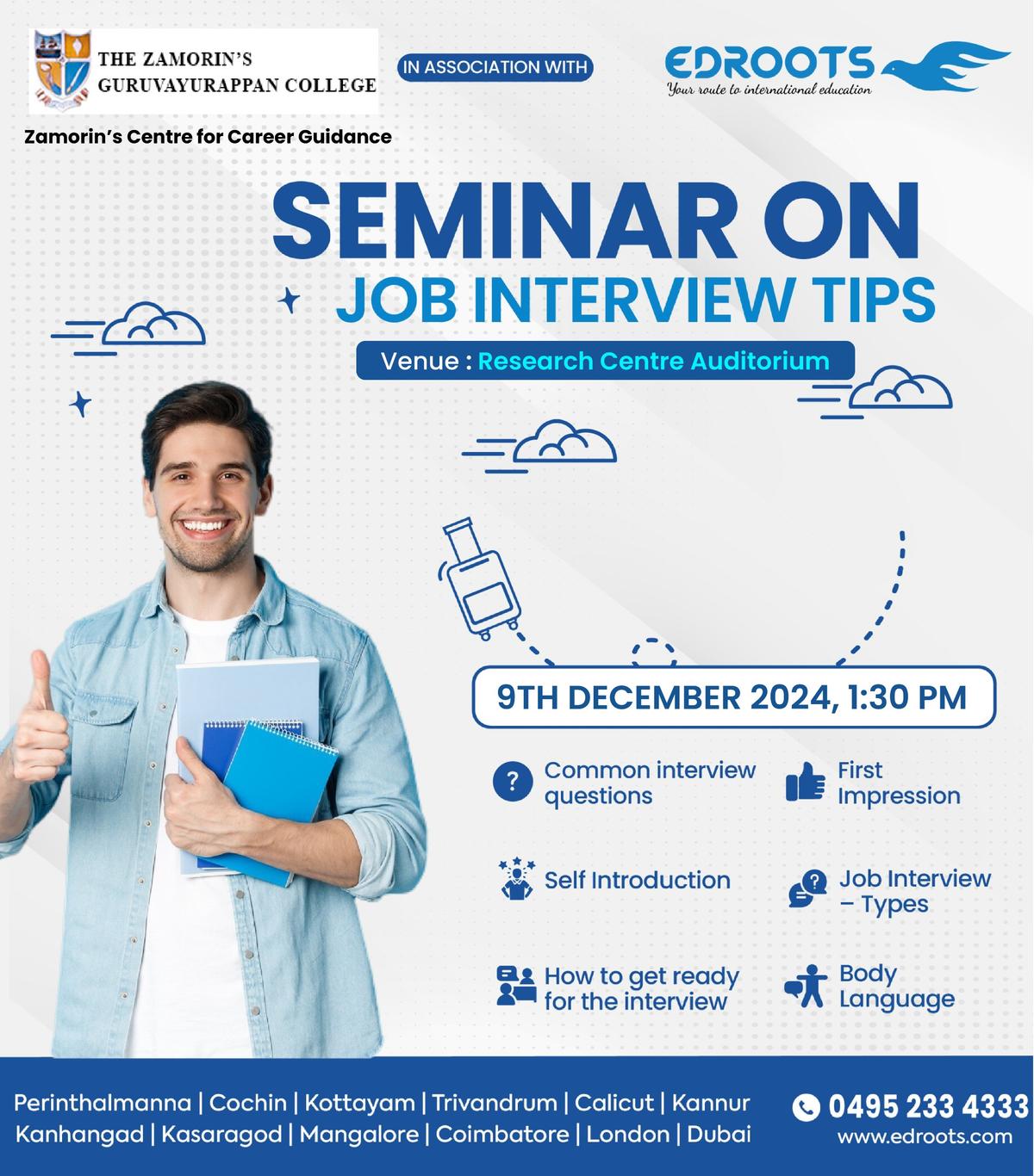 December 9, 2024 | Kozhikode: The Zamorin's Centre for Career Guidance, in association with EDROOTS, organized an insightful seminar on Job Interview Tips at The Zamorin's Guruvayurappan College on December 9, 2024. Held ...