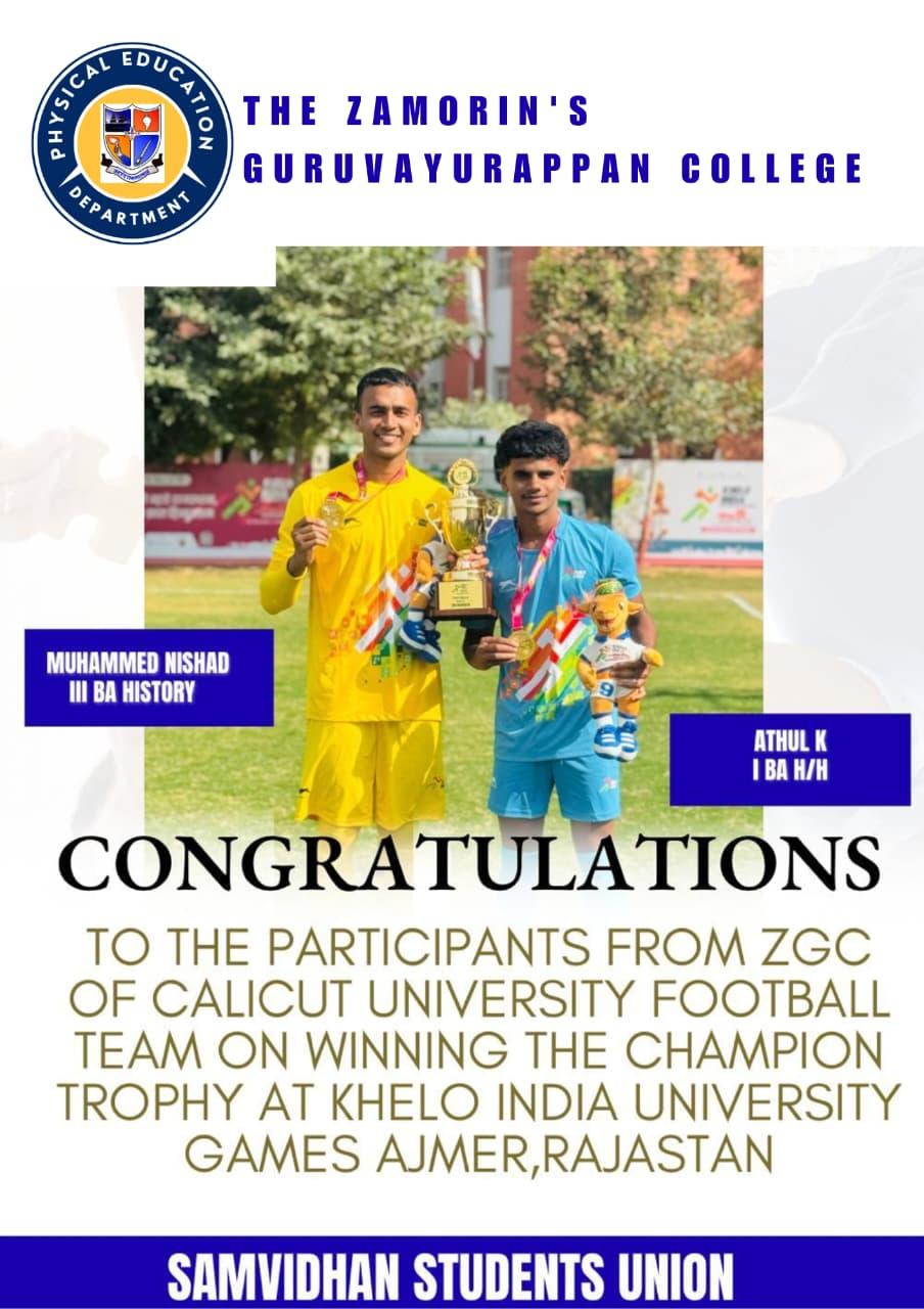 Congratulations to the Participants from Zamorins Guruvayurappan College of Calicut University Football Team on winning the Champion Trophy at Khelo India University Games held at Ajmer,Rajastan.